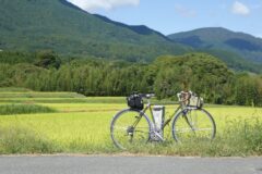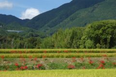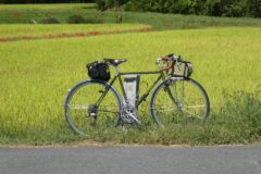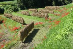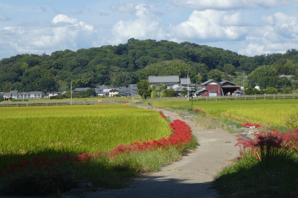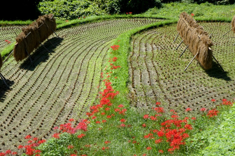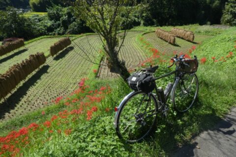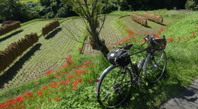 五條側へ少し下って弥勒寺から重阪(へいさか)へ下って行きます。稲架掛(はさがけ)に彼岸花、マッドガード付き自転車が似合う日本の原風景ですね、本日の収穫。