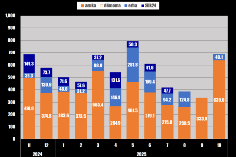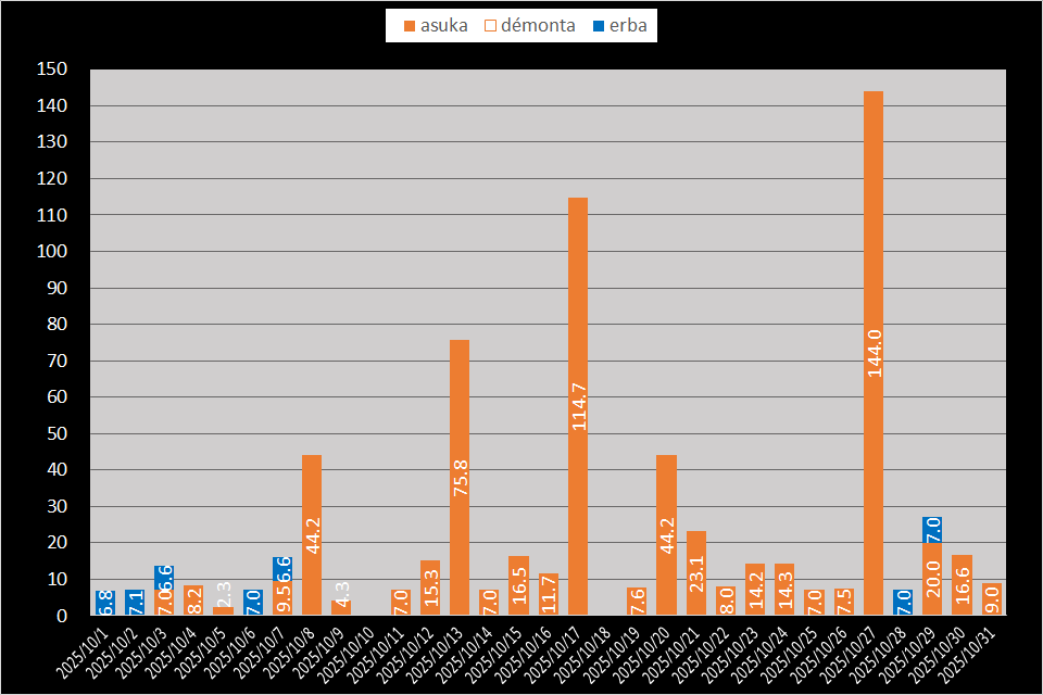 今月の走行、気候も良くなり… やや極端過ぎますが… 「JR全線 秋の乗り放題パス」を利用した遠征が天気が悪く流れたものの頑張って 687.1キロ、今日31日雨で無ければ遠回り通勤で700キロに届かせるつもりだったのですが。今年の累計は5412.0キロ、2022年の6418.4キロは超えたい処。内訳は asuka号 693.0キロ、Erbaロードが48.1キロ。