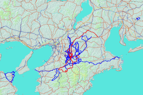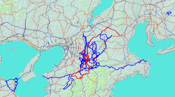 赤線が10月の走行区間、青線が今年9月までの走行区間、京都、滋賀、三重、和歌山と久しぶりに県外へ。なお自宅及び職場周辺は一部割愛しています。