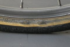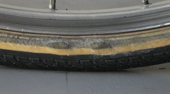 右肩を痛めている事もあって、ここ最近は一番負担の無さそうな延陽伯号こと片倉シルクグロワール24 で通勤しています。前傾姿勢を取らずに上ハンを持った時にasuka号のサブブレーキより延陽伯号のギドネットの方が掌の向きが内側になって楽なんです、ダブルレバーが遠いのが曲者ですが通勤経路は平坦路で変速なしでも行けますしね。後は急激なショックを腕に与えない様に安全運転。ところが先日ふと後輪をみるとタイヤサイドにダメージが、片道7キロ弱の出勤途上でバーストされたらたまりませんので急ぎ手配する事に。