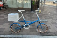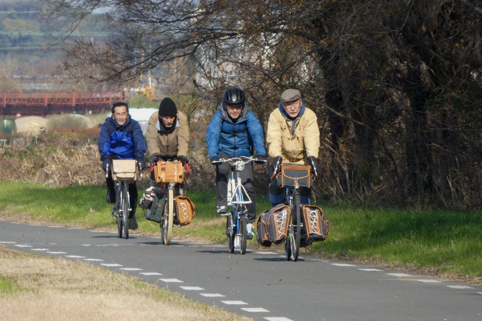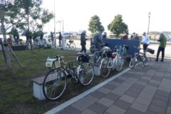 「石川ポタ」では日頃はご一緒できない様な自転車を眼にする事ができます。今日の目玉は、Kawaguzziさんの最初期型FフレームモールトンDX(写真左)とCog-BLKさんの初期型べニックスのベルソー(写真右)、お揃いカラーのBASILのバッグが付いています。