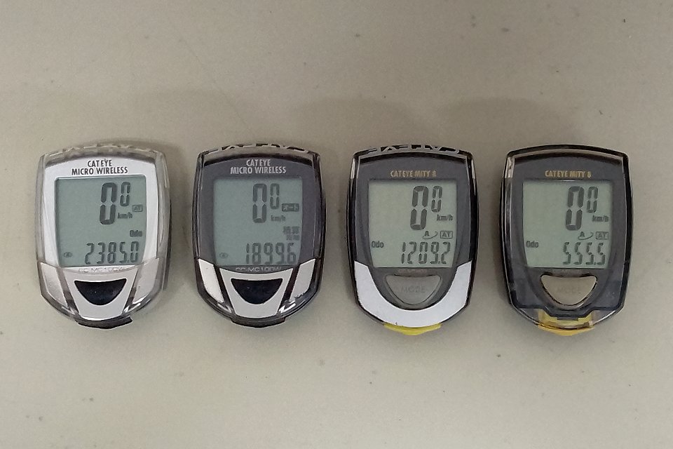 ところでサイコン、最近ではGPSモデルを使用する方が多いのですが、車種毎に4つ使用しています。ロストする心配がない事と電池の心配をあまりしなくても良い事、それぞれの累積距離をタイヤ交換の目安に、ツーリングの時のログ記録用としてGPSを併用してはいますが。ワイヤレスのCC-MC100Wを色違いで2台、ヘッド抜き輪行するasuka号と延陽伯号に。同じくCATEYEのMITY8 CC-MT400 2台はErba号とデモン太に割り当てています。この2機種いまだにヤフオクなどでいくらでも手に入りますし、信頼性は私自身が実証済みですからね。