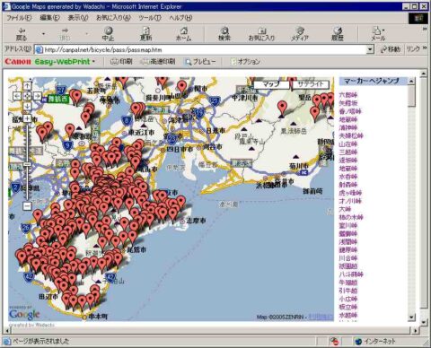 W氏のGoogle Maps API 自動生成ツール「轍 Wadachi」を利用した「走破峠マップ」を一応完成しました。 但しかなりオーバースペックなので、うちの環境(Pentium?W2.8MHz / Memory:1GBype / Bフレッツ・ファミリー100)でも表示に10秒程掛かり、環境によっては表示できない可能性が高いです。 なお右側のペイン(マーカーリスト)の順序は登録順になっているので無茶苦茶です、W氏による機能強化に期待です(^_^;)