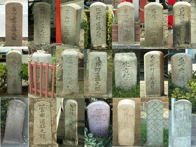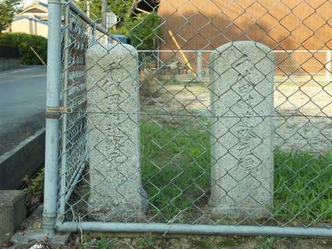 ‘千代田村道路元標'(現 稲沢市)、なぜか2基あります。 どうやら左のものは何らかの理由で復元され、その後オリジナルが出てきたと云うところでしょうか、頭部に十字が彫られており寸法も21cm角と細いです。