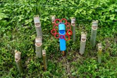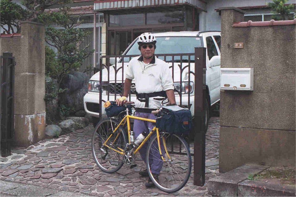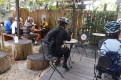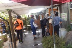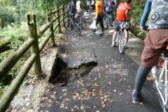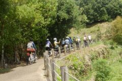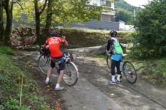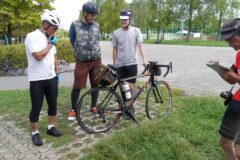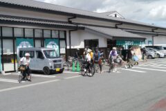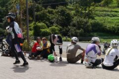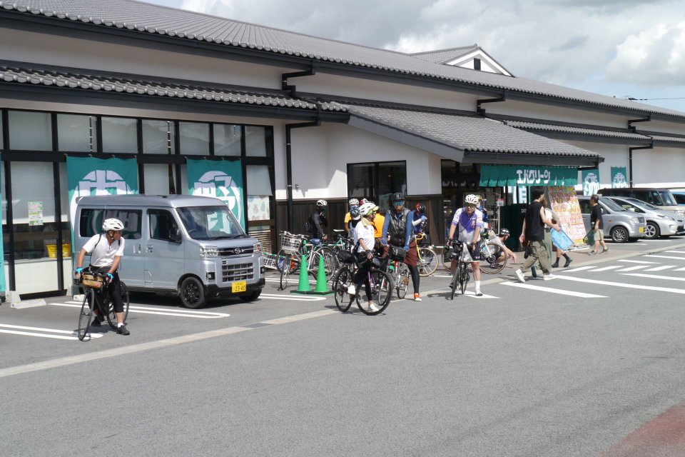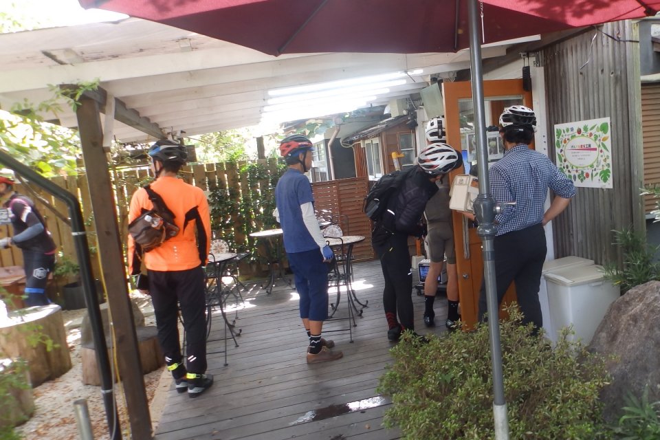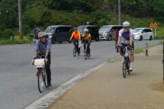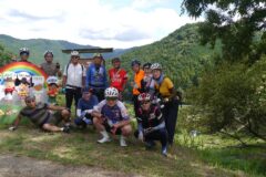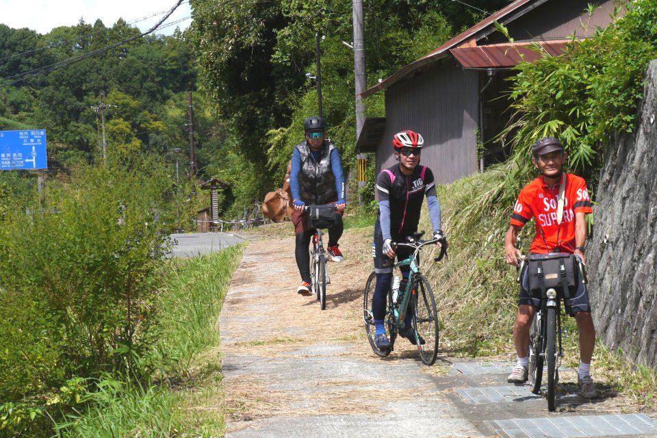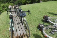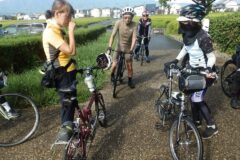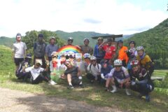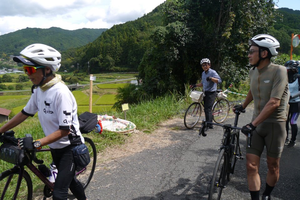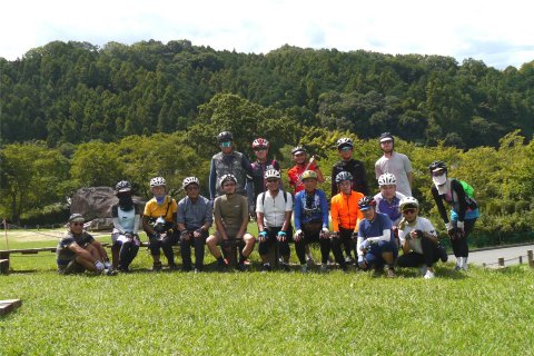 朝風峠の手前で集合写真、今日は三脚を持ってこず、ハンドルに固定するクランプを持ってきたのですが、1テイク目(左)は見事に失敗。大きなサイズの鮮明な写真は「サイクリングの記録」(要認証)へ。