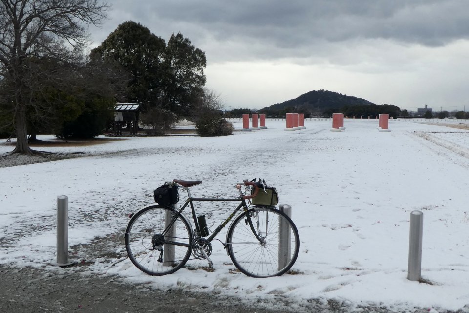 予報に違わず、夜半から降り出した雪で未明には周りは雪景色に。昨年2月24日の様なお天気を期待してカメラを準備してきたので、一旦明日香村の方へ向かいかけたものの強烈な風と寒さに、尻尾を巻いて引き揚げる事に、吹きっ晒しの田圃の中を走っていると突風に煽られて用水路に落ちかけるも、せめて藤原宮跡でのショット位は、畝傍山と耳成山をバックに。